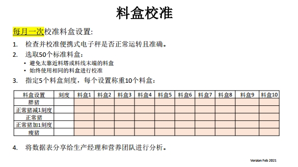 ² 料盒:不同的料厂的饲料容重不同,料盒品牌与安装方式有差异,营养师要帮助猪场矫正料盒料重;