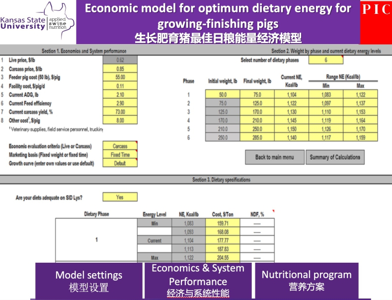 设计最大化经济效益的营养方案,可利用能量模型、赖氨酸模型和色氨酸模型、存栏密度模型,出栏体重模型等工具。