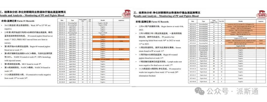 对农场1监测发现仔猪在15-24周连续阴性十周,对农场2监测发现11-20周连续10周阴性。