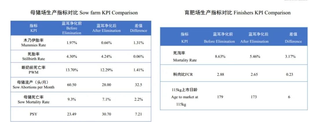 案例农场蓝耳病血清净化前后生产指标对比,发现农场净化后生产成绩有了显著提升,母猪场PSY提高了7.21,育肥场死淘率降低3.17%,料肉比降低0.23。