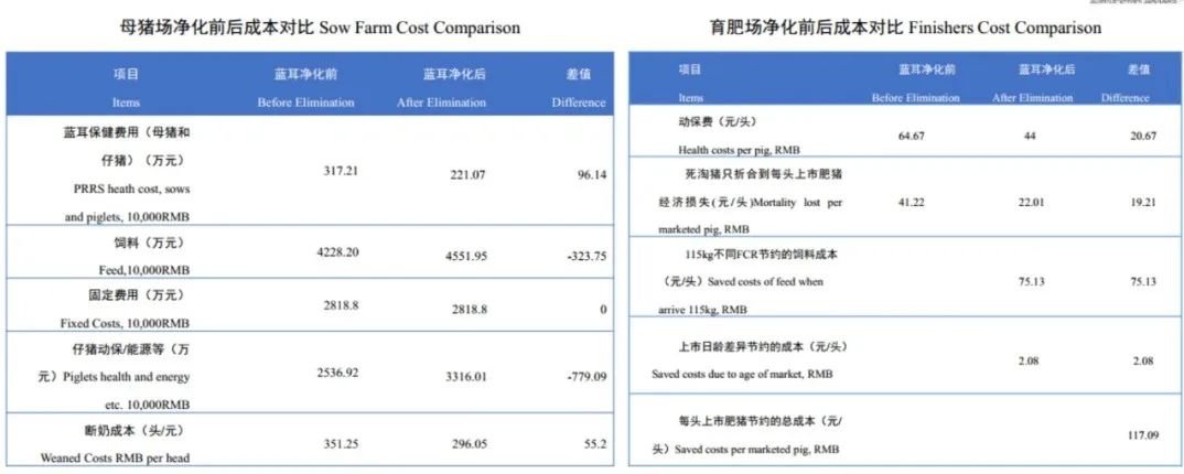 农场蓝耳净化前(一年)及净化后(一年)的自养批次的平均数据,各项投入和产出的计算价格均按实际发生的近3年价格的平均值计算,断奶仔猪到出栏净化前后单头成本差异合计172.29元 。